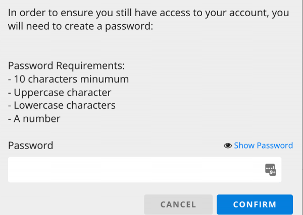 - You will be asked to provide a new password for your account. Please ensure you fulfill the minimum requirements to maximise the security of your password.